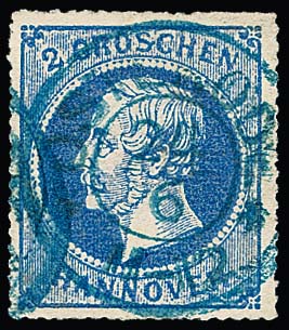 2 Gr. blau, grober Druck von abgenutzter Platte, zentr. gest. (kl. Beanst.), sign. Berger
