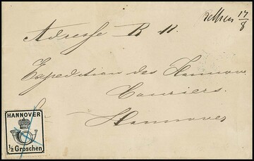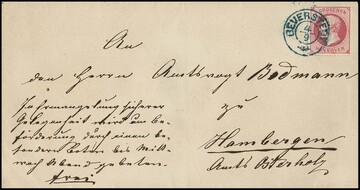 1 Gr. rosa auf seltenem Land-Expreßbrief von Beverstedt (Zier-K2) nach Hambergen b. Osterholz, hs. "In Ermangelung weiterer Gelegenheit wird um Beförderung durch einen besonderen Boten bis Mittwoch abends gebeten", entsprechend rs. "6" Pfg. Landbotenlohn hs. quittiert