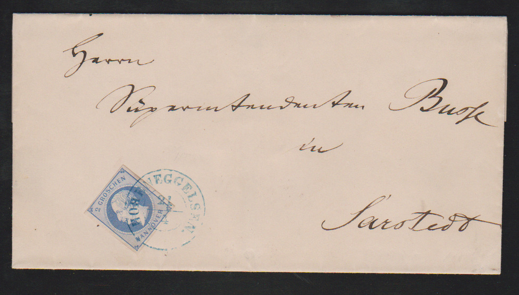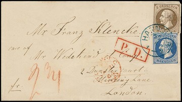 2 Gr. blau und 3 Gr. braun, je einseitig berührt, auf Couvert von Hannover (K2) aus der bekannten "Klencke"-Korrespondenz nach London 1864