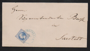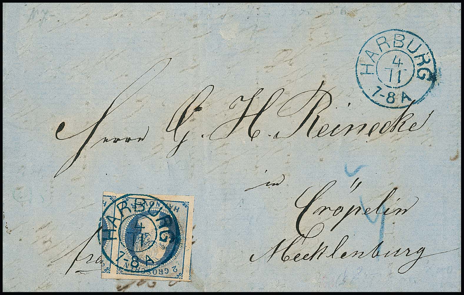 2 Gr. blau, extrem breit geschnittenes Kabinettstück mit Teilen von Nebenmarken an drei Seiten und K2 "Harburg" auf Brief nach Mecklenburg mit Bestellgeld-Vermerk