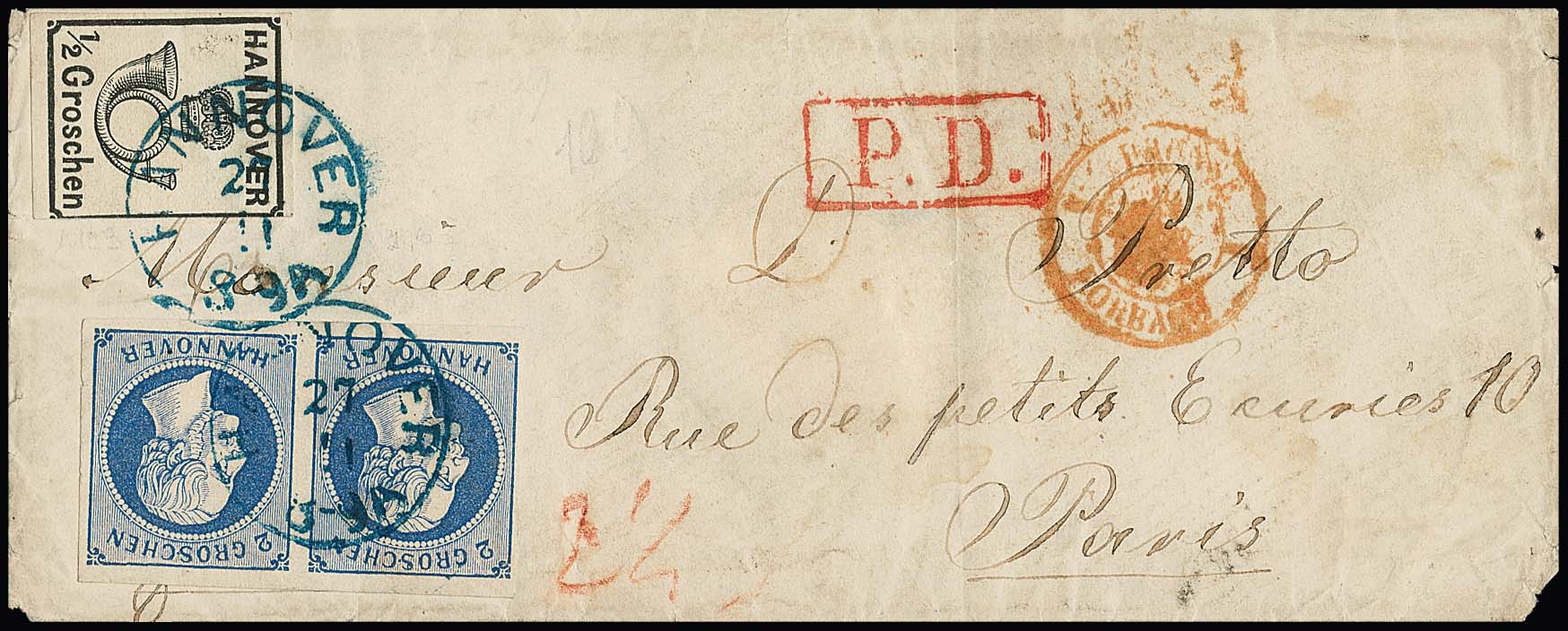 2 Gr. blau, waager. Kabinettpaar nebst leicht berührter 1/2 Gr. schwarz auf kl. Couvert (Beförderungsspuren) mit K1 "Hannover" nach Paris