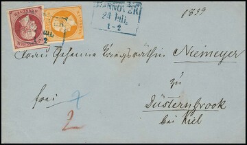 1 Gr. rosa, breitrandig, nebst unten berührter 3 Gr. gelb auf Auslandscouvert von Hannover 1859 nach Düsternbrook bei Kiel (zu dieser Zeit Dänisch), 2 Gr. Inland und 2 Gr. Weiterfranko