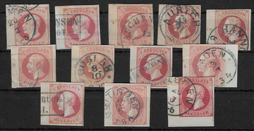 1 Gr. rosa, seltener Viererblock mit K2 "Göttingen", gut gerandet, unauffällig bügig. Größere Einheiten, insbesondere Blockstücke, der kleineren Wertstufen von Hannover sind sehr selten, weil, anders als bei Preußen, Fahrpost mit seinen hohen Portoraten nicht frankiert werden konnte, und bei Auslandsbriefen aufgrund des beschränkten Platzes meist die geringstmögliche Markenanzahl verklebt wurde. Mi. 2000,-