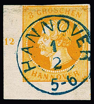 3 Gr. orange, linke untere Bogenecke mit Reihenzahl "12" und idealem K2 "Hannover" (oben Bug ausgebessert), sign. Berger