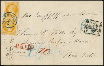 3 Gr. dunkelorange per zwei nebst 1/2 Gr. schwarz auf Überseebrief nach New York, K1 "Osterode" und Leitvermerk "mit Dampfschiff über Bremen", dazu roter Bremer Taxstempel, kleine Mängel