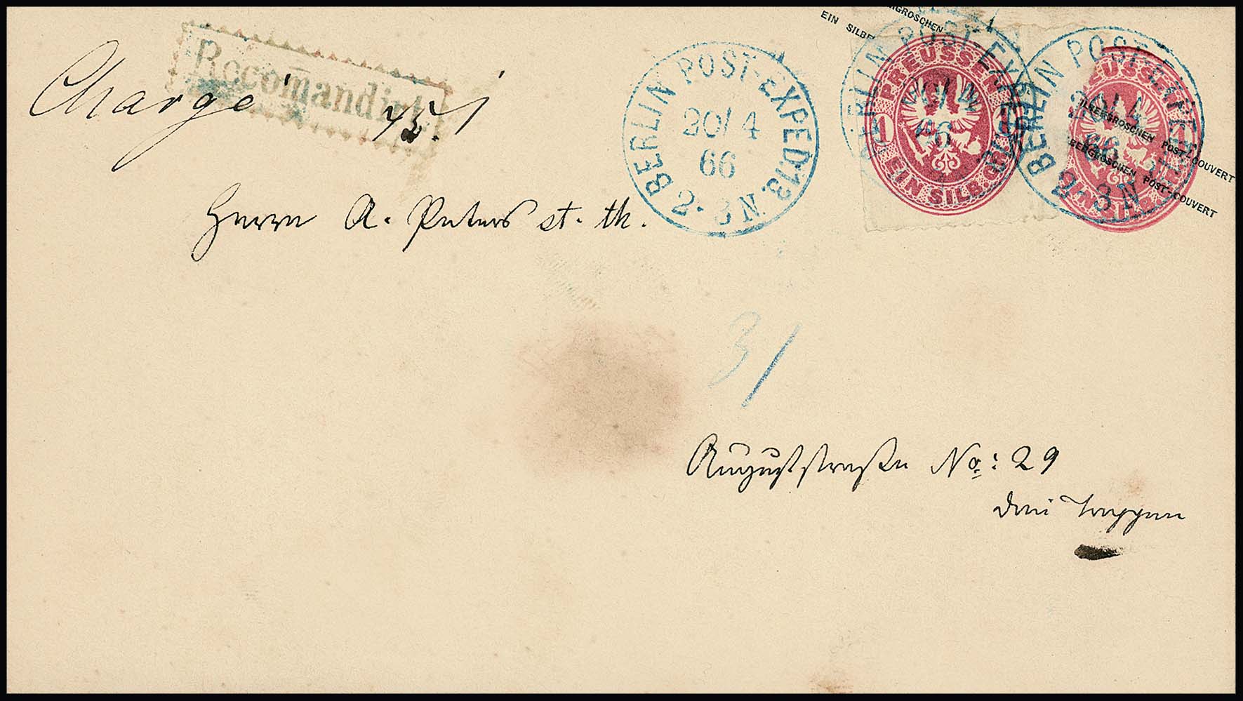 1 Sgr. rosa, perfektes Exemplar auf Ganzsache 1 Sgr. rosa, als Orts-Einschreibebrief aus Berlin 1866