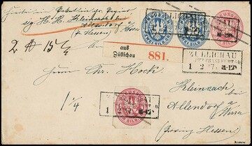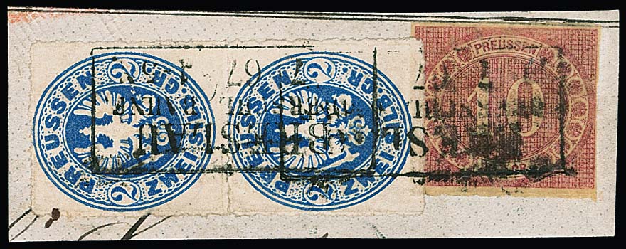 2 Sgr. blau im Prachtpaar, nebst viereckigem Ganzsachen-Ausschnitt 1 Sgr. rosa, auf Ganzsache 1 Sgr. rosa, mit Ra3 "Züllichau Reg. Bez. Frankfurt a.O." als Paketbrief (leicht fleckig) nach Hessen, sign. Feuser u.a.
