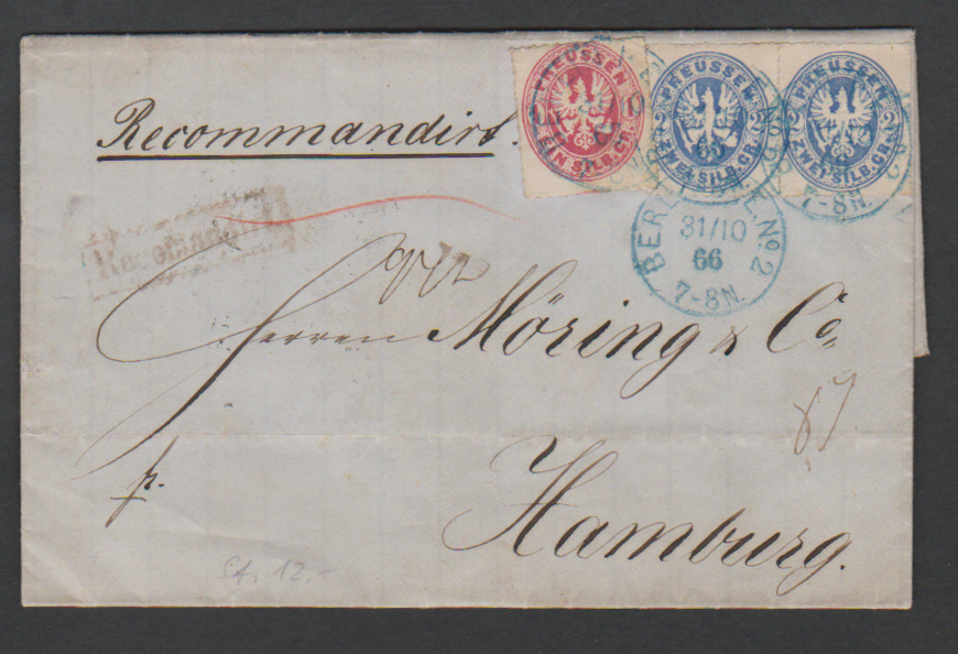 1 Sgr. rosa und Paar 2 Sgr. blau auf Pracht-Recobrief mit blauem K1 "Berlin P.E. No. 2" 1866 nach Hamburg