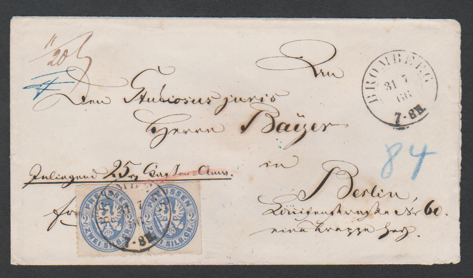 2 Sgr. blau, perfektes Paar auf Wertcouvert von Bromberg (K2) nach Berlin