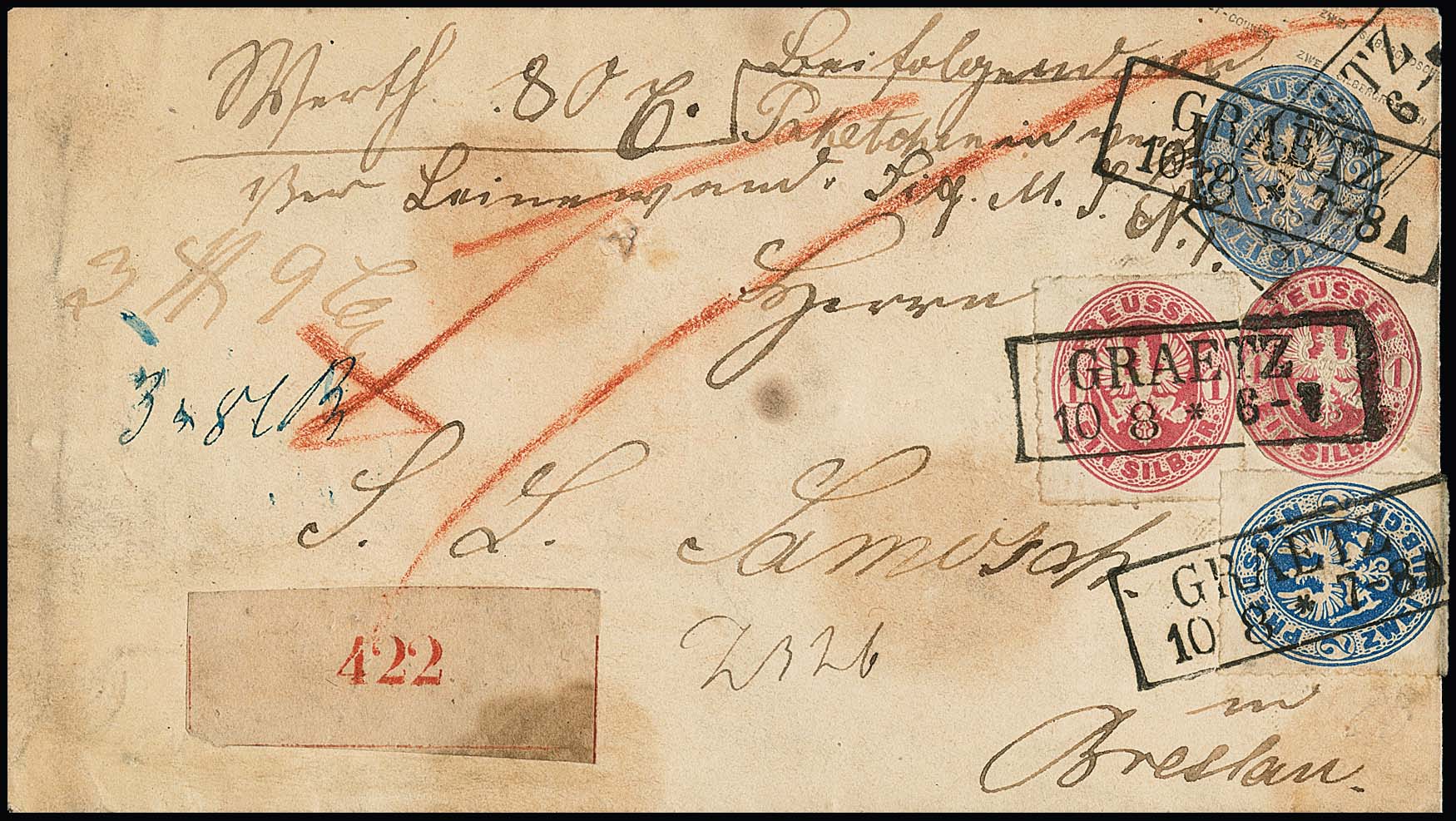 1 Sgr. rosa in wertgleicher Mischfrankatur mit rundgeschnittenem Ganzsachen-Ausschnitt 1 Sgr. rosa und 2 Sgr. blau auf Ganzsache 2 Sgr. (Gebrauchserhaltung) mit Ra2 "Graetz", ferner 3 Sgr. auf Ganzsache 3 Sgr. aus Pritzwalk, beide Paketbegleitcouverts