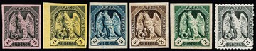 "Burger-Entwurf", 2 Sgr. schw./rosa und schwarz auf schwefelgelbem Papier, zwei seltene Versuchsdrucke aus 1855, sowie vier Neudrucke des Entwurfs, 3 Sgr. dunkelblau, dunkelbraun und bläulichgrün, je geschnitten, sowie in schwarz gezähnt. Attest Flemming
