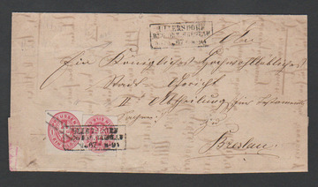 1 Sgr. rosa in wertgleicher Mischfrankatur mit viereckigem Ganzsachen-Ausschnitt 1 Sgr. rosa auf Prachtbrief mit Ra3 "Ullersdorf Reg. Bez. Breslau" (Aufbrauch 30.12.67)