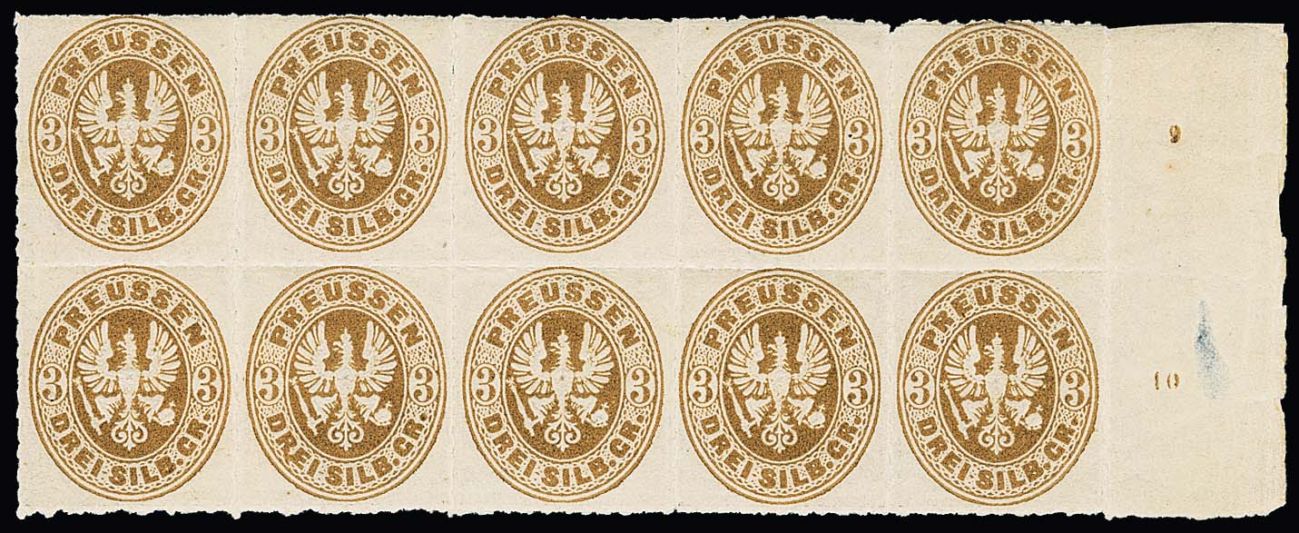 3 Sgr. ockerbraun, meist postfrischer Rand-Zehnerblock, ferner Rand-Vierer- (2, eine Ecke l.o.) und Rand-Sechserblock, -Paar sowie fünf weitere Randstücke