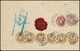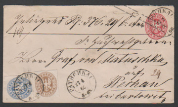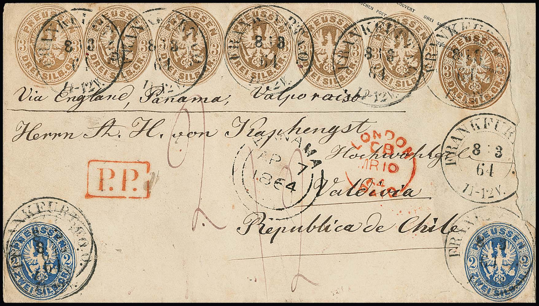 2 Sgr. blau per zwei nebst 3 Sgr. braun per sechs, alle aus Platzgründen rundgeschnitten, auf Ganzsachen-Umschlag 3 Sgr. braun (re. Fehlstelle und Umschlag rs. verkürzte Seitenklappe), K1 "Frankfurt a.O." 1864 nach Vadivia/Chile, befördert über London und Panama mit Durchgangsstempeln, seltene Destination. Fotoattest Brettl