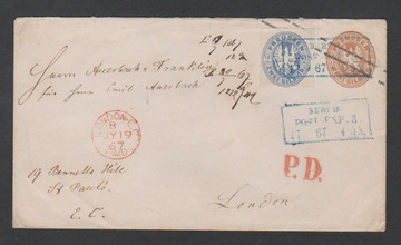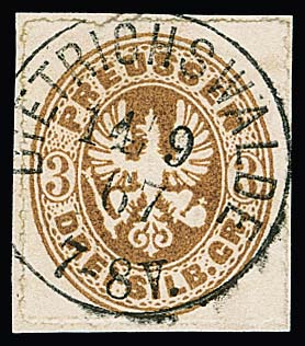 2 Sgr. blau, Prachtstück auf Ganzsache 3 Sgr. ockerbraun (rs. ist die obere Viertelklappe gering verkürzt), mit blauem Ra3 "Berlin Post-Exp. 3" 1867 nach London