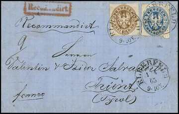 3 Sgr. ocker- bzw. erdbraun auf zwei Briefen, ersterer nebst 6 Pfge. orangerot auf Auslandsbrief nach Frankreich, sowie nebst 2 Sgr. blau auf Postvereins-Recobrief nach Trient (aus Elberfeld vom 1.4.65, frühe Verwendung der Nr. 18b)