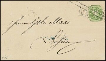 Ganzsache 1 Kr. grün in seltener Letzttagsverwendung (leichte Bugspur) mit Ra3 von Frankfurt, 31.12.67, rs. Ankunfts-K1 vom gleichen Tag
