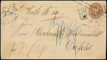 Wappen-Ganzsache 3 Sgr. ockerbraun (dreiseitig geöffnet, typ. Erhaltung mit kl. Aktenspieß) als seltenes Teilfranko mit Ra3 "Münster in Westphalen" und violettem Franko-K1 "Münster F.N.1", Wertbrief nach Crefeld, restliches Porto von 3 Sgr. mittels des Franko-K1 bezahlt