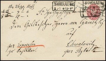 Wappen-Ganzsache 1 Sgr. rosa mit Ra2 "Sohrau" (vom 1.1.) als Landexpreßbrief nach Chwalowitz im Landbezirk von Rybnik an einen Gutsbesitzer. Rs. nur "2 1/2 Sgr. botenlohn" quittiert statt des erhöhten Landexpreß-Botenlohns, was sehr ungewöhnlich ist