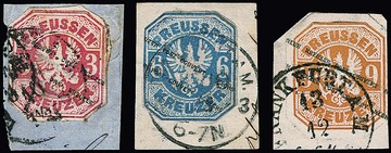 Kreuzer-Ganzsachen-Ausschnitte 3 Kr. karmin, 6 Kr. graublau und 9 Kr. braun, je üblich achteckig geschnitten, auf drei Briefstücken, sign. Banker, Kastaun, seltene Ausschnitte! Mi. 2950,-