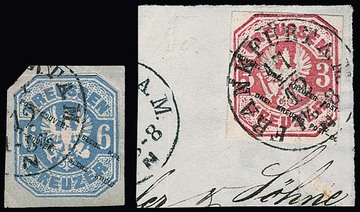 Wappen-Ganzsachen-Ausschnitte aus Couverts für den ehemaligen Taxis-Bezirk, zwei Briefstücke, 1 Sgr. rosa achteckig (sign. Banker, Flemming) mit K1 "Gera", sowie 2 Sgr. blau viereckig mit K1 "Neustadt". Mi. für GAA20 550,-, GAA21 ohne Preis!