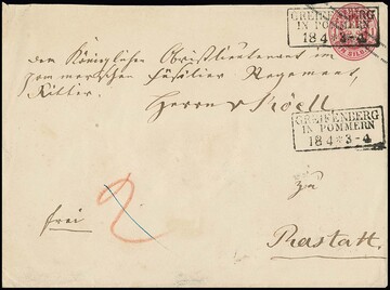 Wappen-Ganzsache 1 Sgr. rosa im Großformat mit Ra3 "Greiffenberg in Pommern" als Teilbarfrankatur 1865 an einen Oberleutnant in der Bundesfestung Rastatt (typische leichte Gebrauchsspuren)