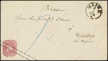 Ganzsache 3 Kr. rosa, nach Ablauf der Gültigkeit verwandt mit Aufgabe-K1 "Mainz" vom 2.1. (rs. Ankunftsstempel vom 3.1.68), mit Nachtaxe "7x" nach Wendelsheim bei Alzei, Couvert an den Rändern unbedeutend getönt