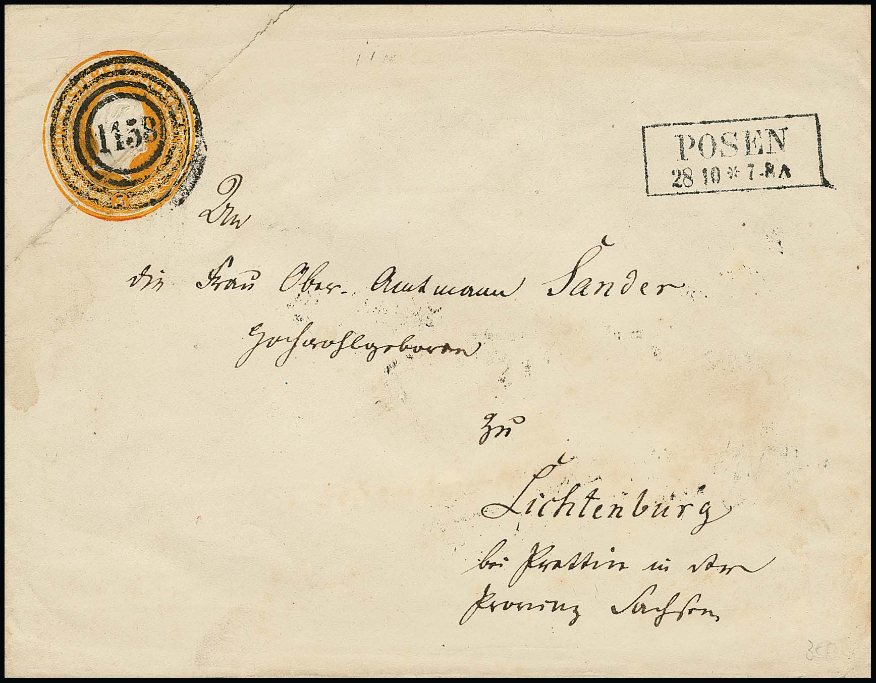 "1158" nebst Ra2 "Posen" je klar auf Kopf-Ganzsache 3 Sgr. gelborange im normalen (17.9.1851) und großen Format (28.10.), trotz stärkerer Gebrauchsspuren bzw. einmal Bruch im Seidenfaden, denkbar seltenes Paar mit dieser Entwertung, gerade auf einem Großformat!