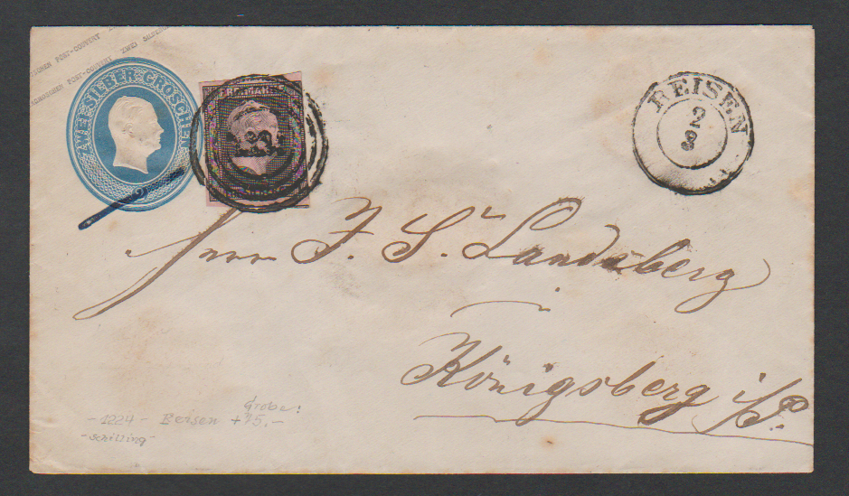 "1224" nebst K2 "Reisen" auf Ganzsache 2 Sgr. blau (leichte Gebrauchsspuren) mit Zusatzfrankatur 1 Sgr.