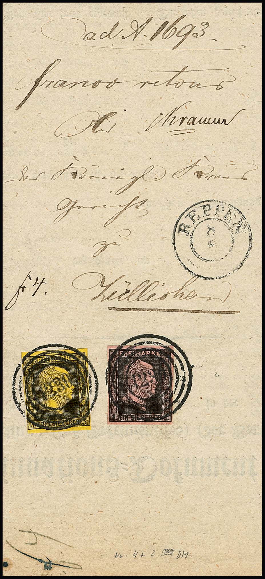 "1230" nebst K2 "Reppen" auf Luxus-Post-Ins.-Doc. mit 1 und 3 Sgr. (aus Juli 1851)