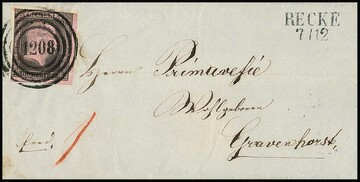 "1208" nebst vorphil. L2 "Recke" (v. 7.12.1850) klar auf kleinem Briefchen mit 1 Sgr. schw./lilarosa (teils berührt bzw. angeschnitten). Auf Brief sehr seltener NS der OPD Münster, keine handvoll Belege bekannt! Feuser + 1200,-
