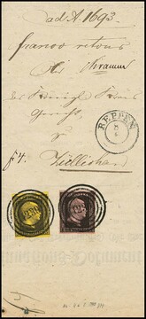 "1272" nebst Ra2 "Ruhrort" auf drei Briefen, dabei Prachtbrief 1 Sgr. schw./lilarosa, sowie bessere Kombination Nr. 2 mit 6a (diese unten angeschnitten)