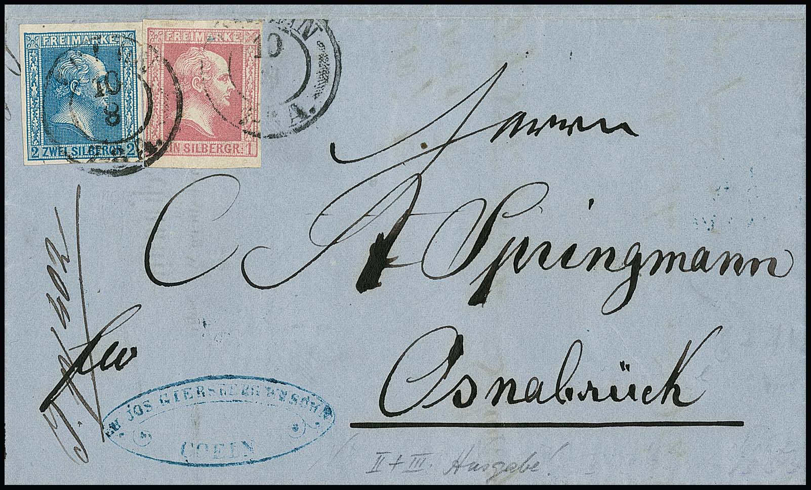 1 Sgr. rosa in Mischfrankatur mit 2 Sgr. blau auf Prachtbrief mit K2 "Coeln" nach Osnabrück 1859