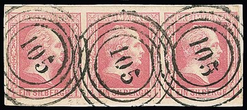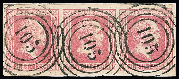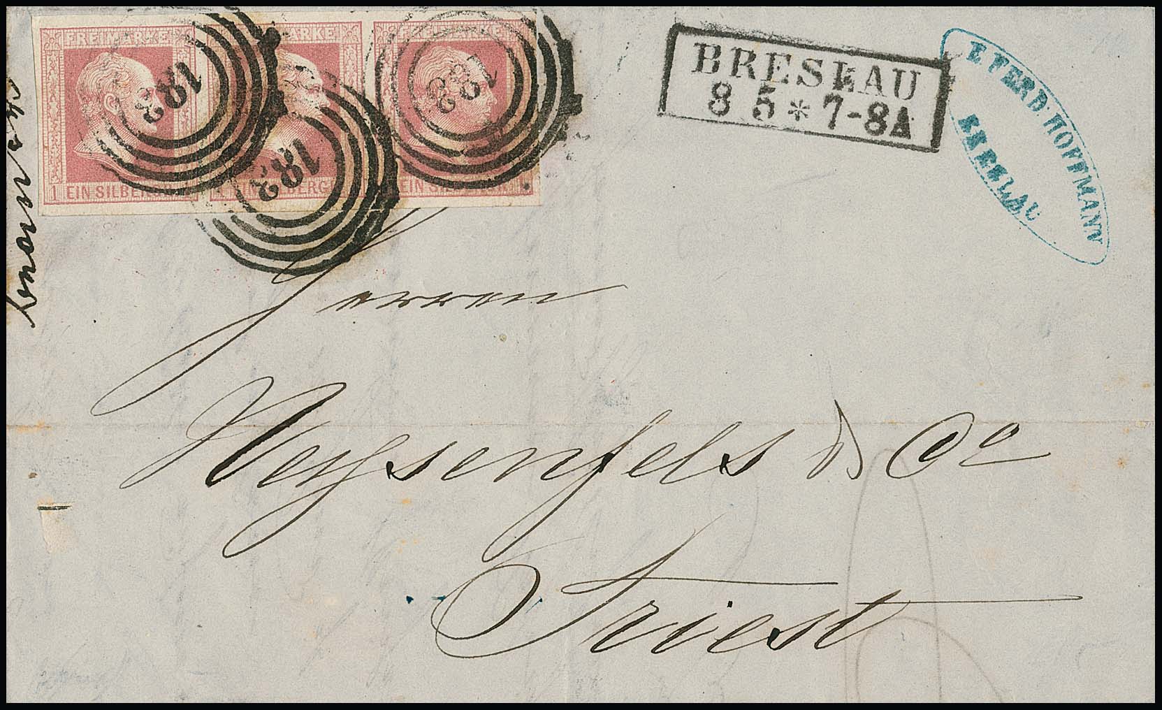 1 Sgr. rosa, meist sehr breitrandiger Kabinett-Dreierstreifen auf gef. Brief aus Breslau, 8.5.1857. Sehr frühe Verwendung dieser Marke (Ersttag 16.4.67!)