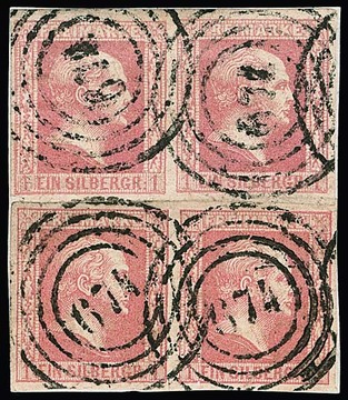 1 Sgr. rosa/karmin, Plattenfehler "Ausbruch links unten" sowie "gebrochene Randlinie oben", ferner 2 Sgr. "beschädigtes R" und "Strich durch FREIMARKE", je gestempelt mit Mängeln, seltene Marken, alle kompetent signiert. Mi. 2900,-