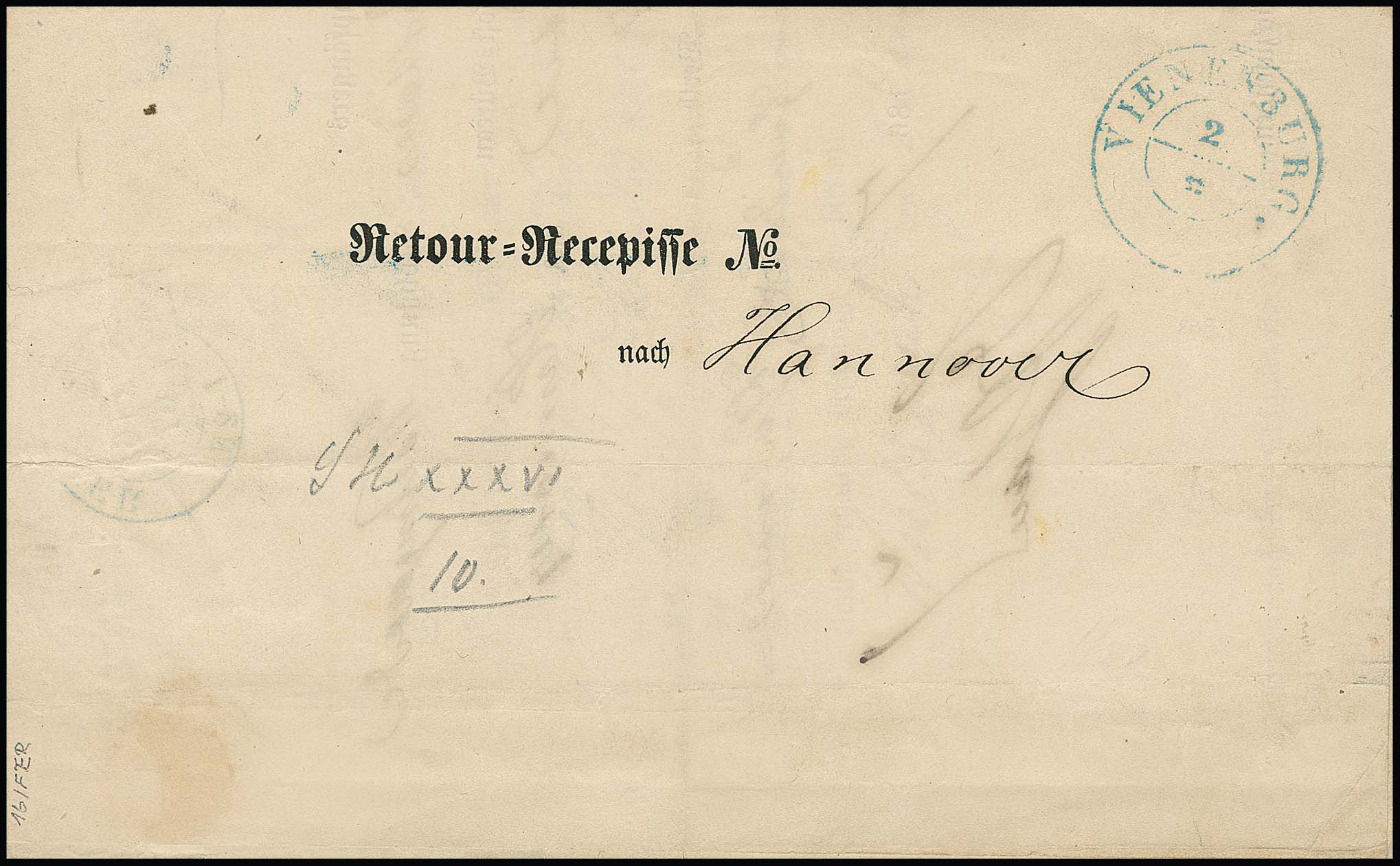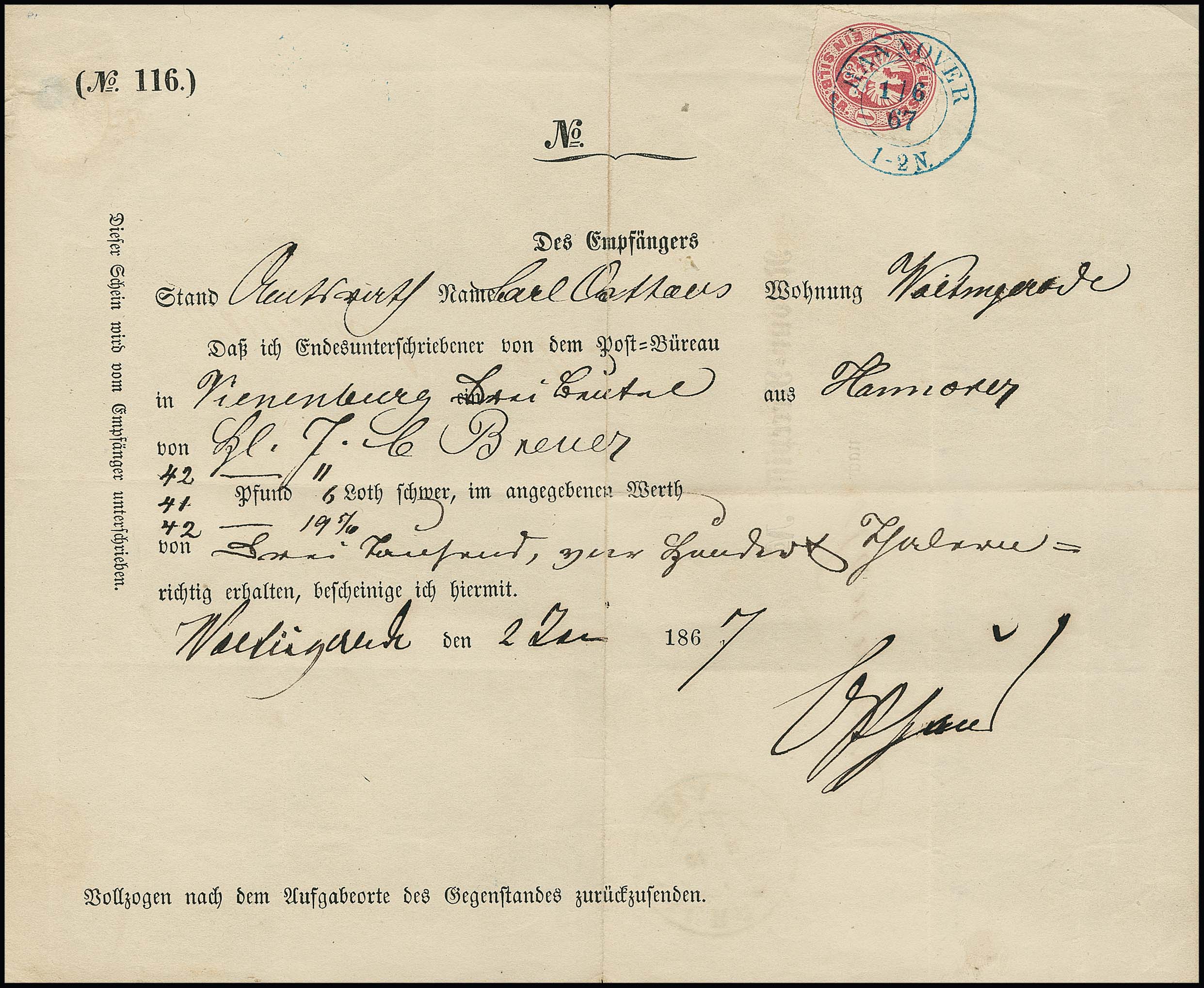 1 Sgr. karmin, Prachtstück mit blauem K2 "Hannover", 1.6.67, innen auf Retour-Recepisse aus Vienenburg (vs. blauer K2)