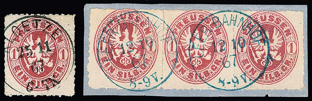 1 Sgr. karmin lose mit neuem Grotesk-K1 "Kloetze", sowie im Dreierstreifen auf Luxusbriefstück mit neuem blauem Grotesk-K1 "Leer Bahnhof"