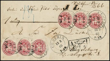 1 Sgr. rosa, sechs Briefe in etwas untersch., teils Kabinett-Erhaltung, u.a. drei Einzelfrankaturen auf Ortsbereichsbriefen (zweimal Berlin, einmal Neudamm, dieser ex Baldus), Viererblock auf Post-Ins.-Doc. aus Asbach, sowie per sechs auf Paketbrief