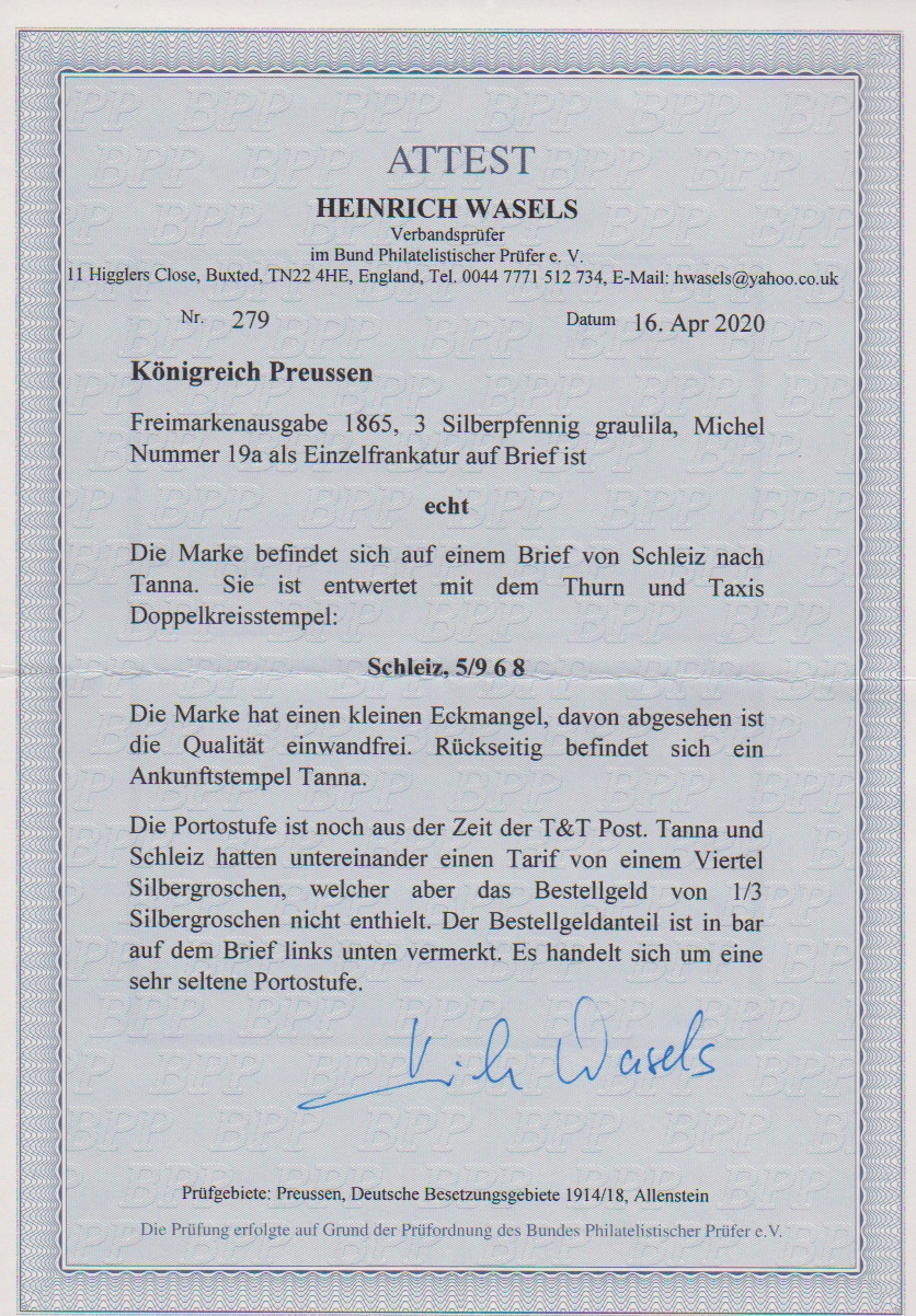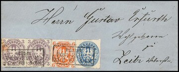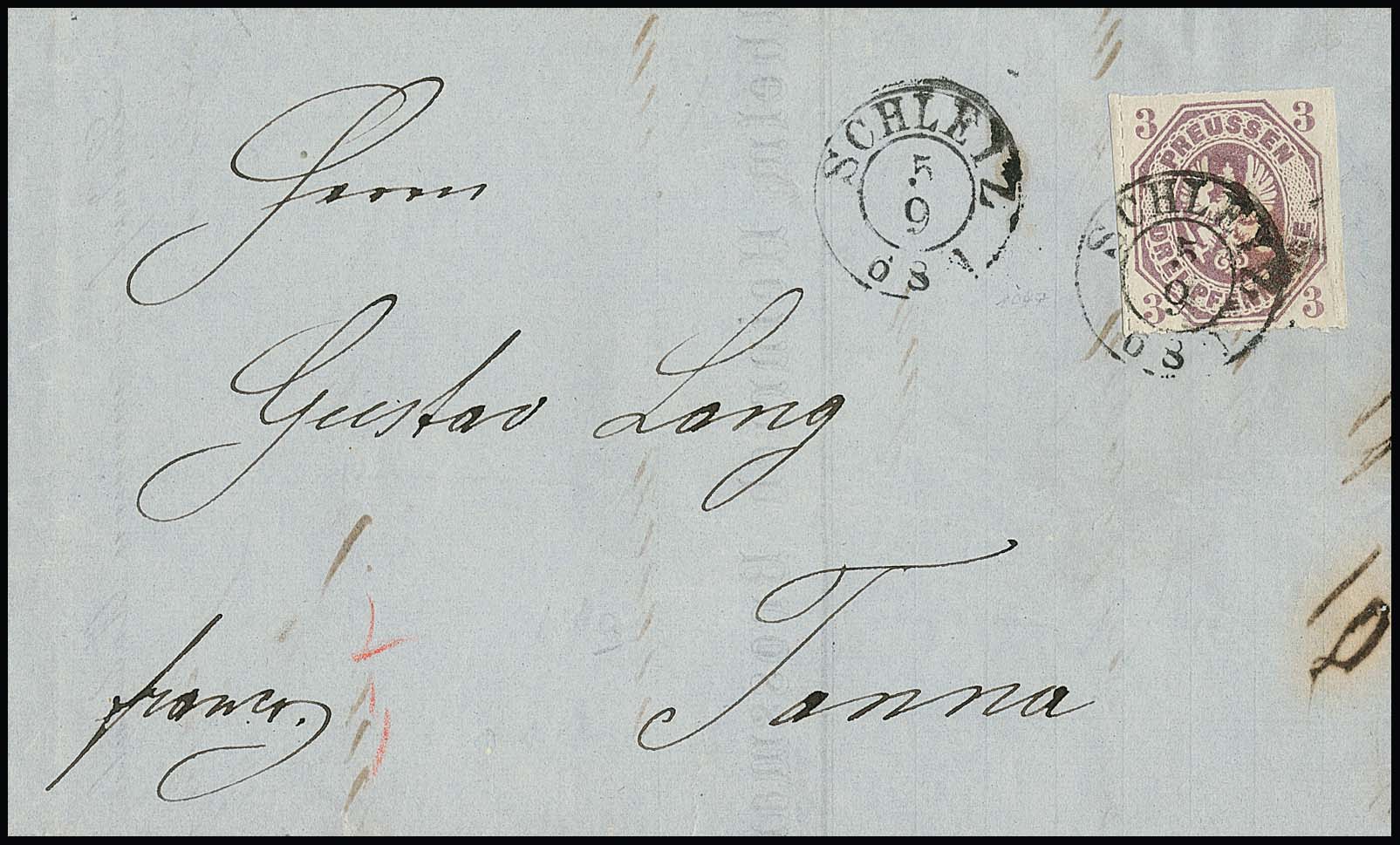 3 Pfge. graulila, farbfrische Einzelfrankatur mit links und rechts Teilen der Nebenmarken (kl. Eckaufspaltung) auf Brief nach Tonna, sauberer Taxis-K2 "Schleiz 5/9" (1867). Die Einzelfrankatur der 3 Pfge. ist selten und kam nur im Gebiet der ehem. Taxis-Post vor. Praktisch sämtliche bekannten Belege hierzu sind mit der Mi.-Nr. 19b (dunkelpurpur) frankiert. Mit der Mi.-Nr. 19a eine Frankatur-Rarität. Fotoattest Wasels. Mi. 3000,- +