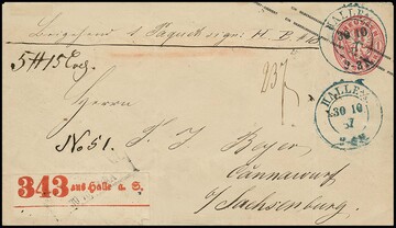 3 Pfge. lila, zwei tadellose Paare rs. auf Ganzsache 1 Sgr. rosa, mit blauem K2 "Halle a.S." als Paketbegleitbrief in den Landbezirk von Sachsenburg. Couvert leichte Mittelfalte ausserhalb. Ungewöhnliche Frankatur, sign. Krause, Banker und Attest Kastaun