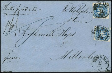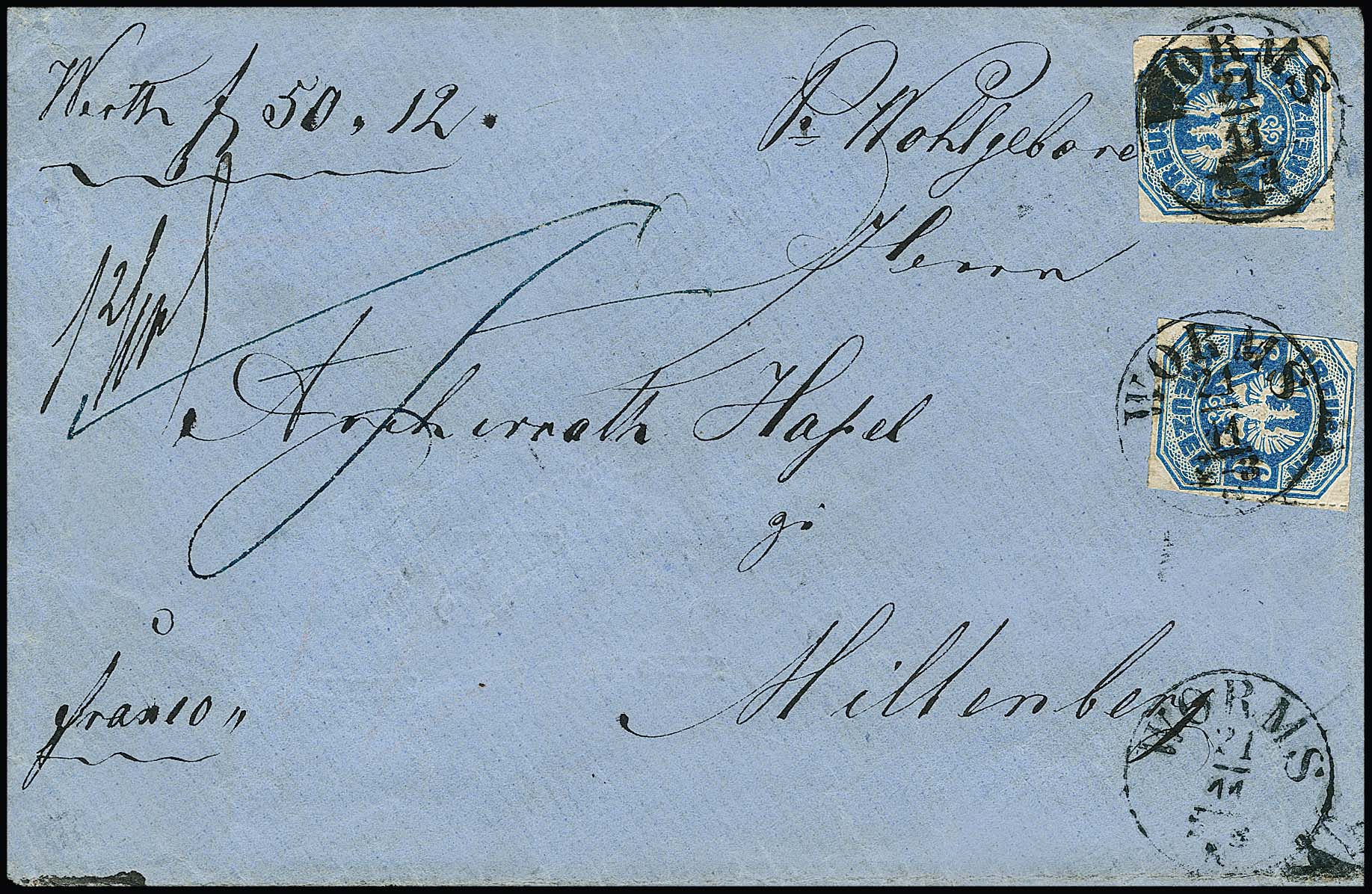 6 Kr. blau per zwei, teils Scherentrennung, auf seltenem Wertbrief von "Worms" (K1) nach Miltenberg, sign. Flemming