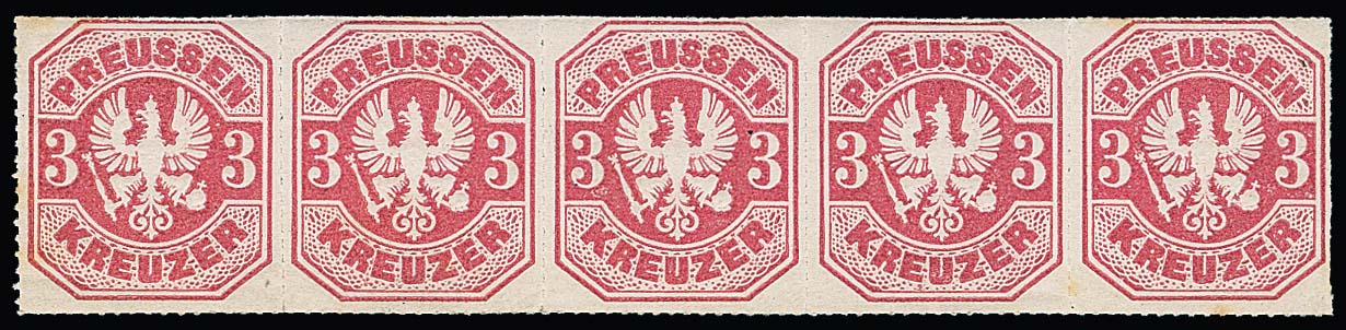 3 Kr. karminrosa im postfrischen (!) Fünferstreifen, die beiden Randmarken etwas fleckig, mittlerer Dreierstreifen tadellos