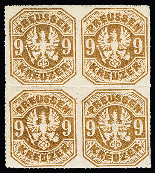 3 Kr. karmin, 6 Kr. blau und 9 Kr. ockerbraun, je ungebrauchte Viererblöcke (einige Marken postfrisch), Mi. 520,- +