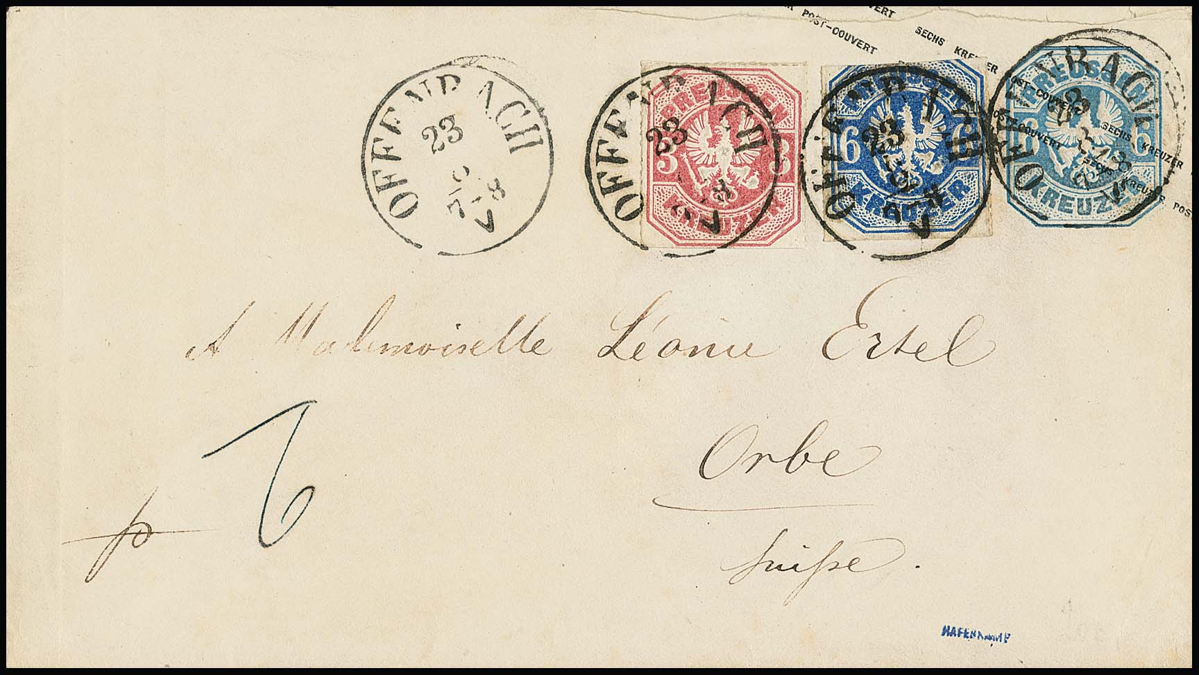 3 Kr. karmin nebst 6 Kr. ultramarin (beide teils Scherentrennung) auf Ganzsache 6 Kr. hellultramarin (oben etwas unsauber geöffnet), klare Taxis-K1 "Offenbach", nach Orbe/Franz. Schweiz, sign. Haferkamp