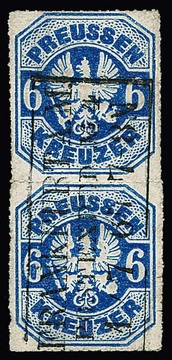 6 Kr. blau, senkrechtes Paar (kl. Mgl.) mit klarem und praktisch vollständigem Ersttags-Ra3 "Frankfurt a.M. Postexped. No. 4" vom 1.7.1867. Sign. mit Befund Kastaun