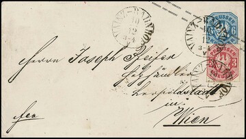 3 Kr. karmin auf Pracht-Ganzsache 6 Kr. ultramarin, mit K1 "Mainz Bahnhof" nach Wien, sign. Pröschold