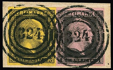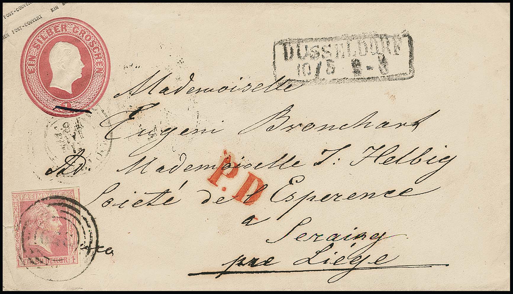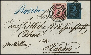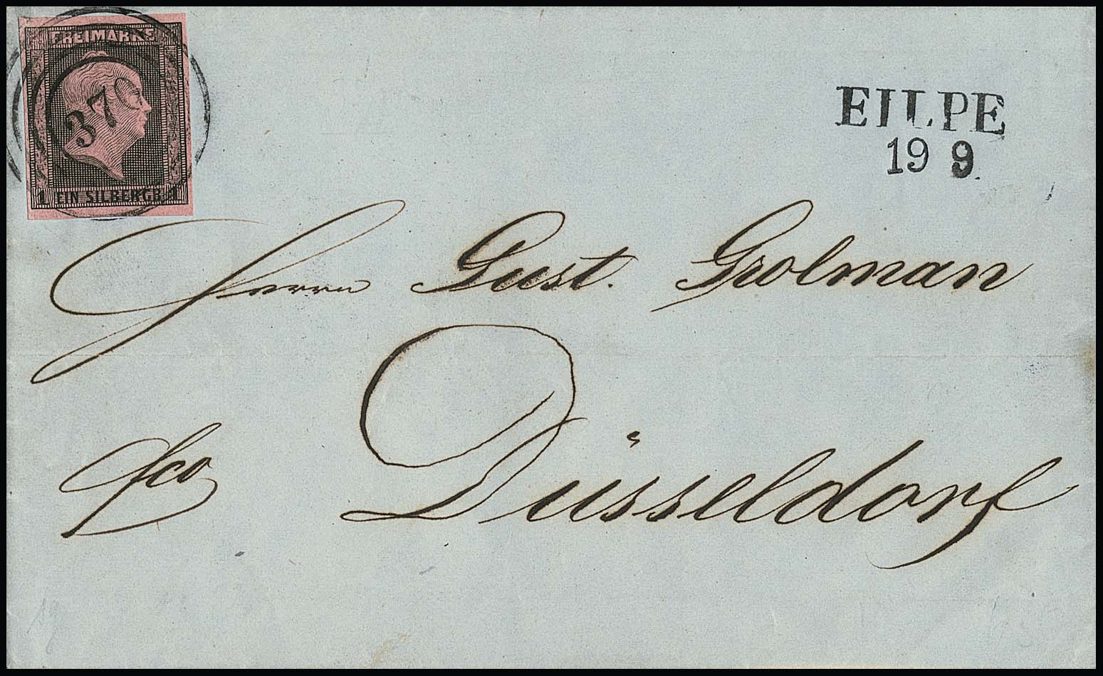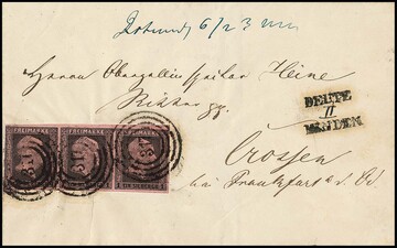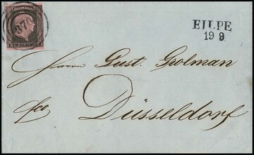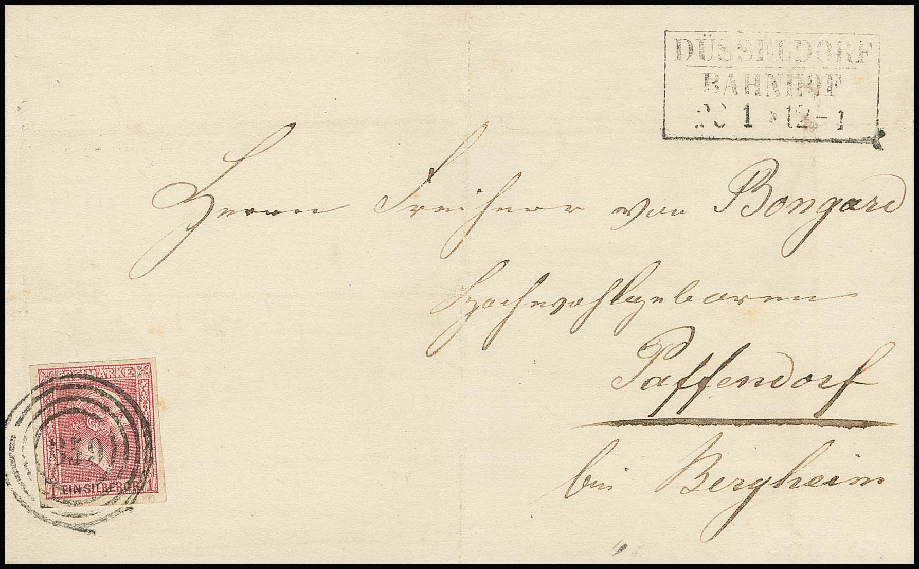 "359" nebst Ra2 "Düsseldorf" auf zwei Briefen 1 Sgr. rosa (auf Ganzsache 1 Sgr. nach Belgien) bzw. karmin (kl. Mgl.), sowie Bahnhofstype nebst Ra3 "Düsseldorf Bahnhof" auf gefaltetem Brief mit Prachtstück 1 Sgr. Gittergrund