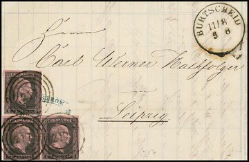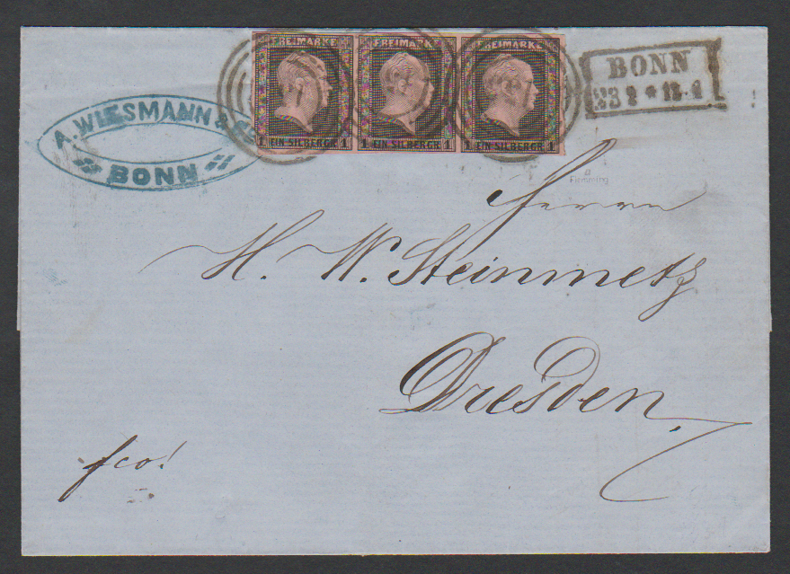 "155" nebst Ra2 "Bonn" auf Faltbrief mit Dreierstreifen 1 Sgr. (ein Wert schräge Ecke), sign. Flemming, Voigt