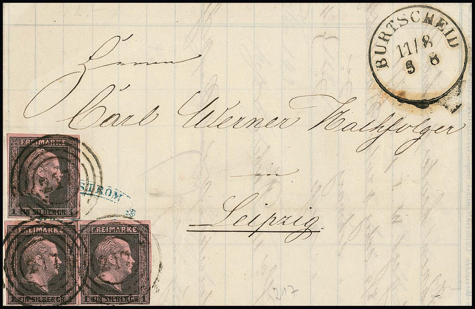"217" und Neben-K1 "Burtscheid" in Sonderform klar auf Brief mit dreimal 1 Sgr., sowie nebst K2 auf Auslandsbrief mit Paar 2 Sgr. nach Zürich, kl. Mgl.