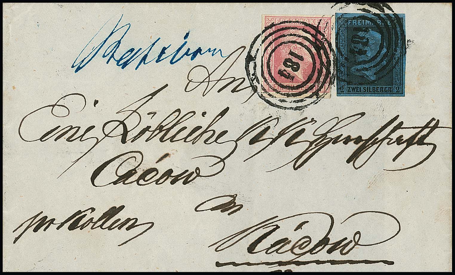 "184" (Breslau Bahnpost) nebst hs. Aufgabe "Ratibor" auf (rs. etwas verkürztem) Brief mit Prachtstücken 2 Sgr. schw./blau und 1 Sgr. karmin